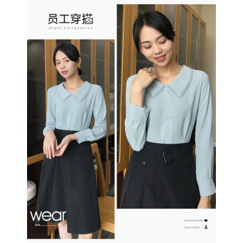 尚都比拉长袖女士衬衫秋装新款小花边娃娃领职业风雪纺珍珠扣上衣 浅灰蓝 M |