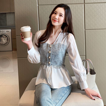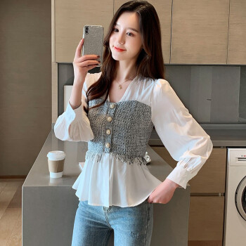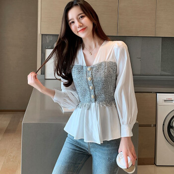 淑蔓婷衬衫女秋季新款V领收腰雪纺衫女长袖拼接时尚小衫气质上衣女 白色 S |
