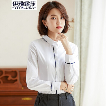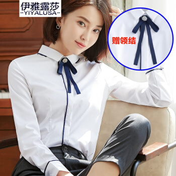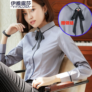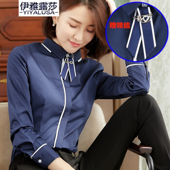 伊雅露莎长袖衬衣女商务通勤棉质职业装衬衫防走光暗扣大学生面试工作服923-1 单件深蓝衬衫 L |