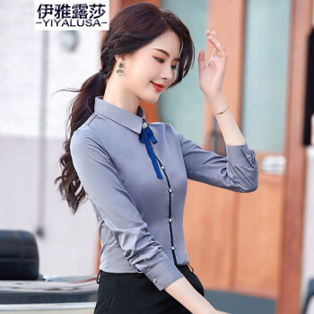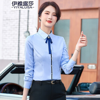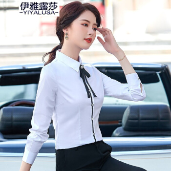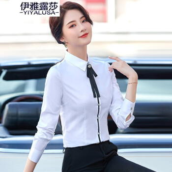 伊雅露莎职业装大码棉质衬衫女长袖20秋季新款时尚领结衬衣面试通勤工作服2157 单件白色衬衫 L |