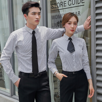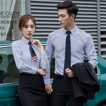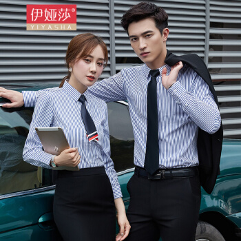 伊娅莎职业男女同款条纹长袖衬衫销售售楼部上班工作服logo定制修身白领寸衣男商务正装打底衬衣套装 291单件白底蓝条衬衫【女】 XL |