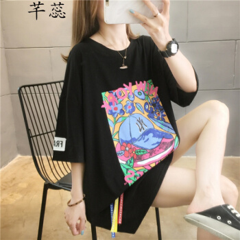 芊蕊短袖t恤女新款时尚韩版印花圆领中长款宽松大码女装胖MM半袖打底上衣服ins潮 粉红色 M |