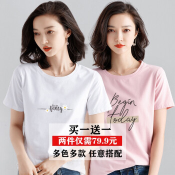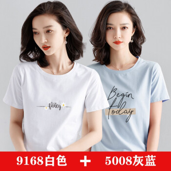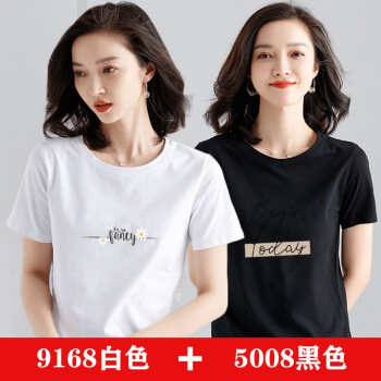 【两件装】知语者女装短袖t恤女宽松体恤大码显瘦上衣夏季新款百搭韩版印花时尚纯棉打底衫T恤女 9168白色+5008粉色 L《105-115斤》 |