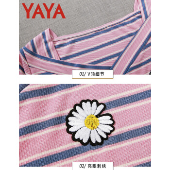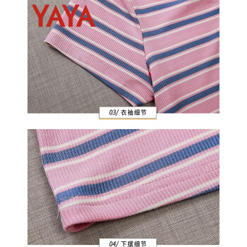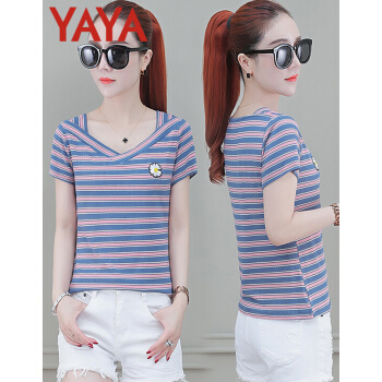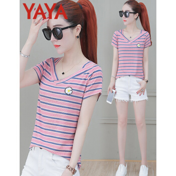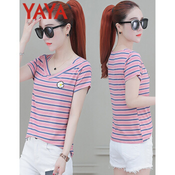 鸭鸭服饰yayaT恤女装夏季新款短袖夏装新款衣服女短款条纹t恤女薄款修身洋气v领上衣 粉条纹 请选择正确尺码 |