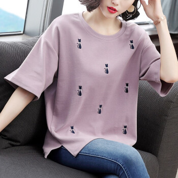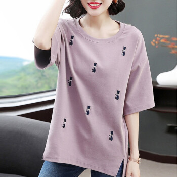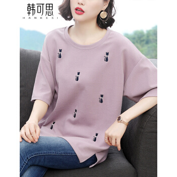 【精选好货】韩可思夏装新款大码女装宽松短袖t恤女小衫棉胖mm遮肚妈妈上衣衫中长款立体刺绣百搭 紫色 请拍正确尺码 |
