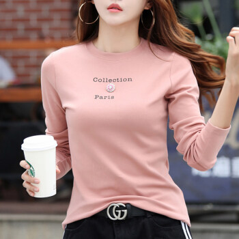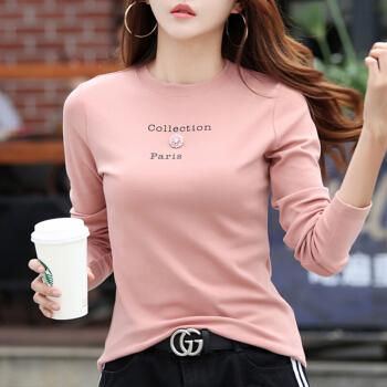 薇妃妙长袖t恤女秋季新款韩版时尚百搭弹力圆领打底衫 5370-粉色 S(80-95)斤 |