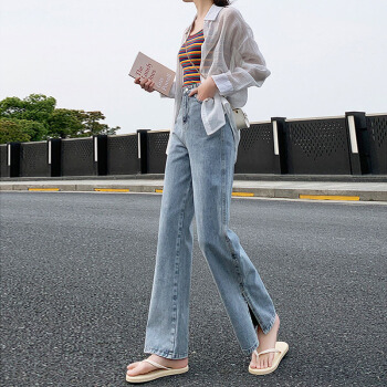 开叉阔腿牛仔裤女直筒宽松泫雅风高腰夏季薄款垂感拖地裤 蓝色 XXS |