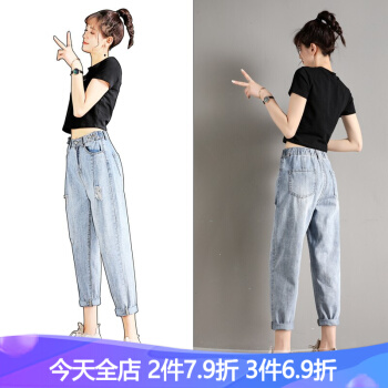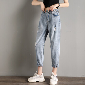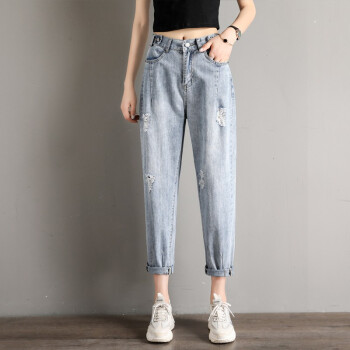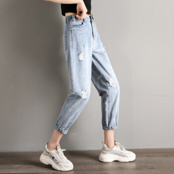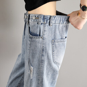 破洞牛仔裤女宽松直筒春夏季新款韩版高腰显瘦百搭老爹裤休闲松紧腰哈伦萝卜裤子 919浅蓝(破洞) M码 |