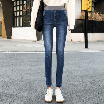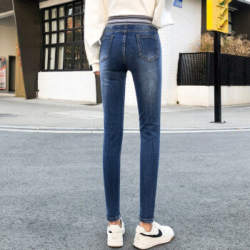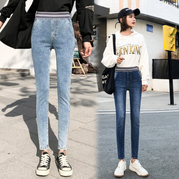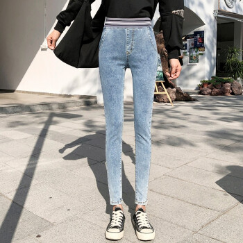麦潮尚秋款牛仔裤女士长裤松紧高腰紧身显瘦弹力小脚女裤子 浅蓝色 XS建议70斤内 |