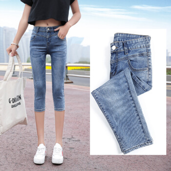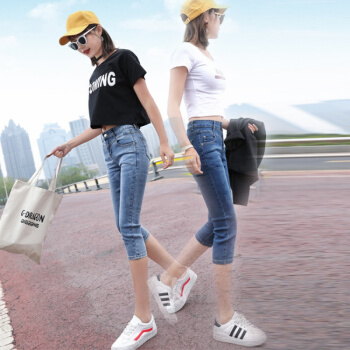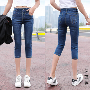 P.E.K.D 新款夏季七分牛仔裤女薄款宽松韩版7分裤女弹力修身显瘦中裤 深蓝 28 |