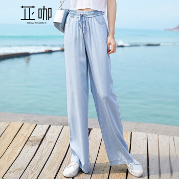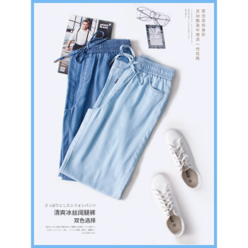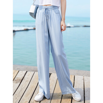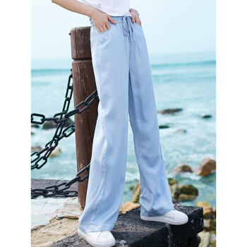 芷咖女裤纯天丝牛仔裤阔腿裤女松紧腰新款夏薄款高腰冰丝裤子垂感直筒宽松长裤 蓝色 28 |