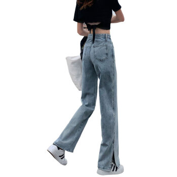 丝克诺依 牛仔裤女阔腿裤夏季薄款新款浅色开叉直筒宽松泫雅风高腰垂感拖地裤潮 浅蓝长裤 M |