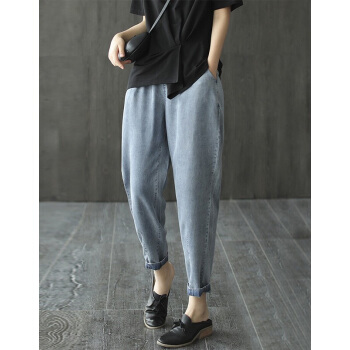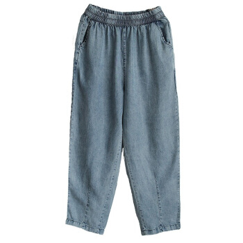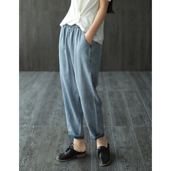 龙芝美 天丝牛仔裤女夏季新款复古文艺松紧腰宽松哈伦九分裤女 蓝色 请拍正确尺码 |