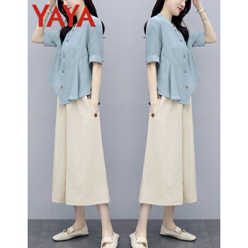 鸭鸭服饰yaya休闲裤女女装夏季新款棉麻套装时尚洋气减龄显瘦文艺气质复古阔腿裤女两件套装女 蓝衣米裤 请选择正确尺码 |