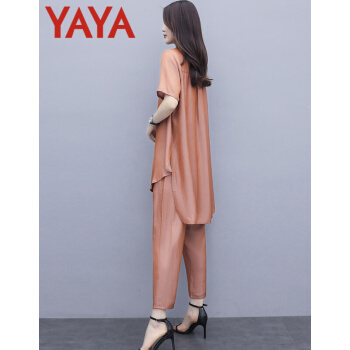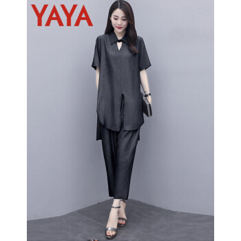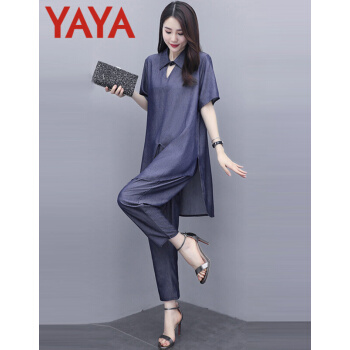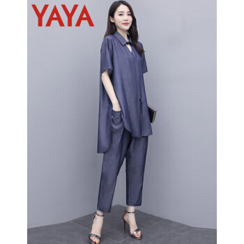 鸭鸭服饰yaya休闲裤女时尚妈妈装两件套女装夏季新款洋气大码宽松中年人成熟套装女 牛仔蓝 请选择正确尺码 |