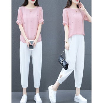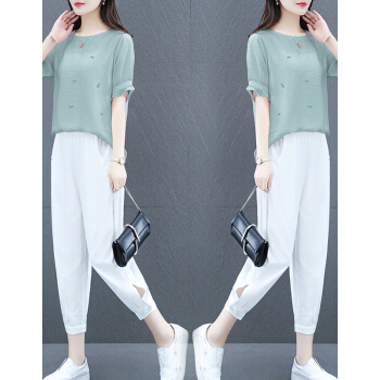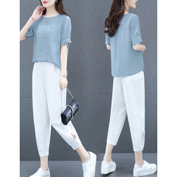 婪澈休闲裤女新款女装夏季大码女装洋气微胖妹妹显瘦时髦棉麻套装两件套套装女 蓝色 请下正确尺码 |