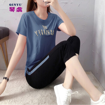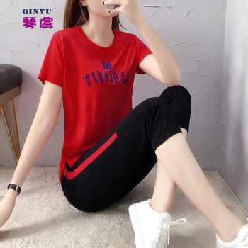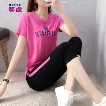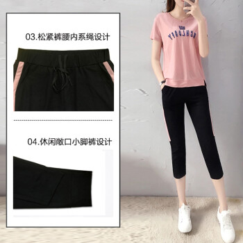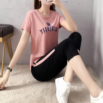 琴虞QY休闲裤女休闲运动服套装女夏季新款学生宽松绣花七分裤时尚短袖两件套 粉色 M【建议80-100斤左右】 |