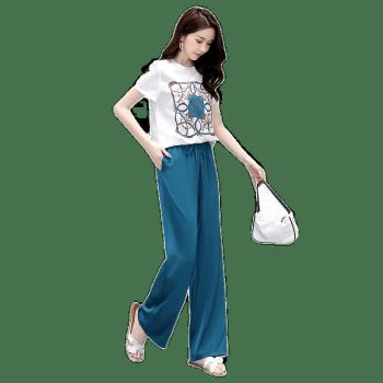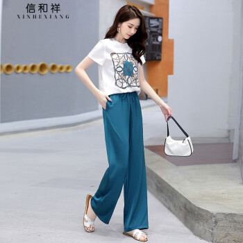 信和祥休闲裤女雪纺套装女夏装新款气质女神范衣服洋气减龄休闲两件套阔腿裤 蓝色 L |