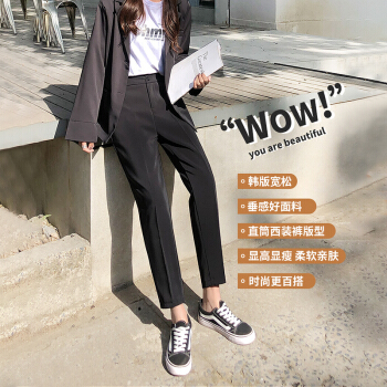 浪莎休闲裤女薄款夏季九分西装哈伦裤子宽松高腰工作直筒女裤 黑色 XL |