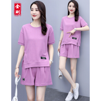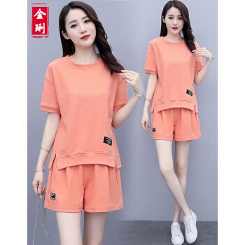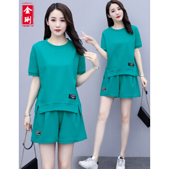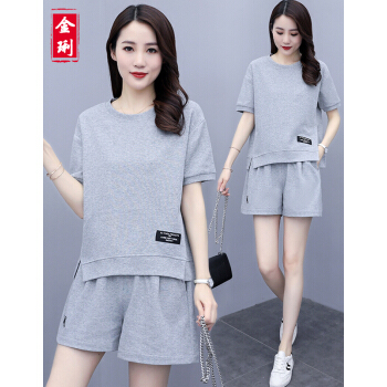 金琍JL短裤女休闲套装女夏季新款圆领短袖上衣短裤套装学生宽松晨练跑步大码女装减龄显瘦两件套 海蓝色 L【建议90-110斤】 |