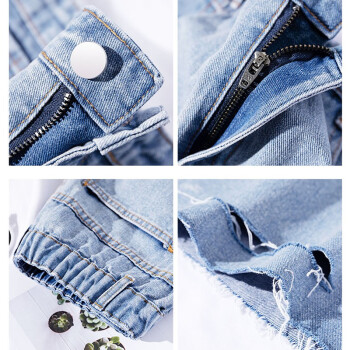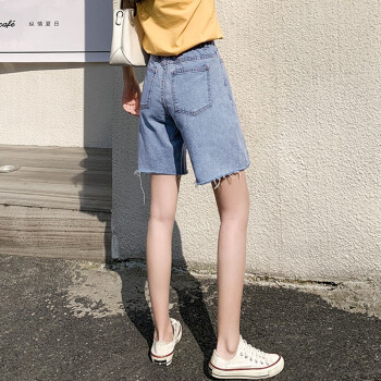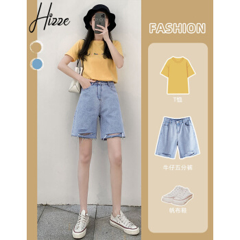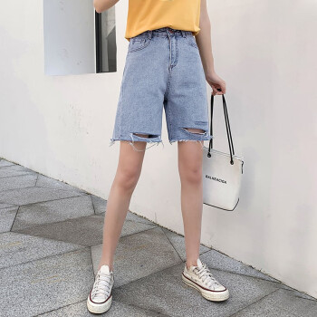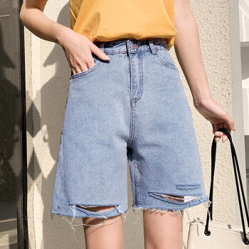 【精选好货】Hizze牛仔短裤女新款潮夏季薄款5五分高腰a字宽松直筒港味百搭休闲中裤 浅复古蓝【破洞】 请拍正确尺码 |