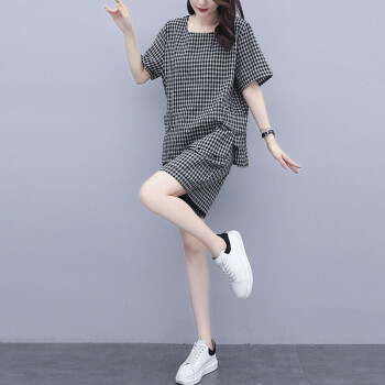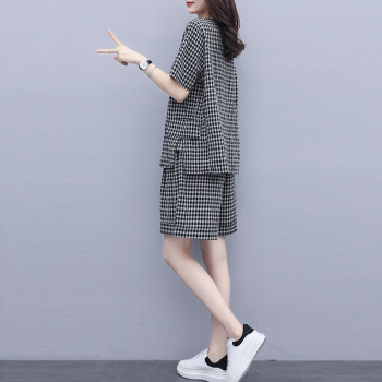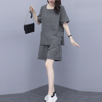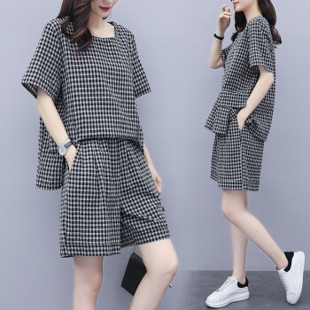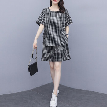 伊轩坊短裤女夏新款大码女装韩版宽松显瘦洋气减龄格子休闲时尚套装女两件套 格子套装 L |