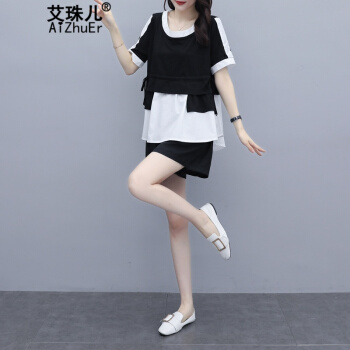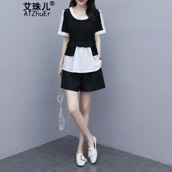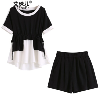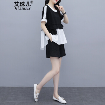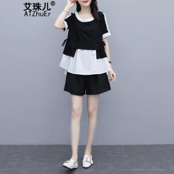 艾珠儿 短裤女夏季新款女装休闲运动棉麻两件套大码宽松显瘦阔腿短裤时尚套装女 黑白 短裤套装 M |