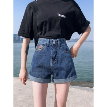 丝克诺依 牛仔短裤女夏季新款高腰a字显瘦宽松卷边胖mm大码女生热裤 黑灰色 M |