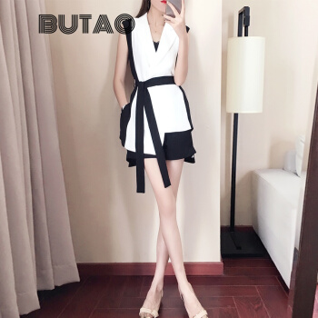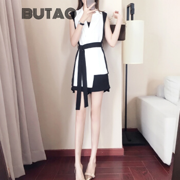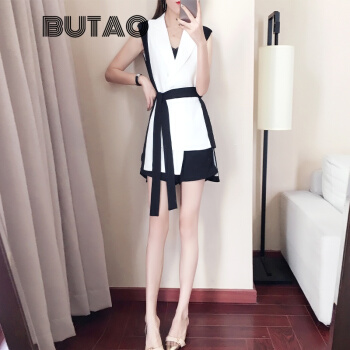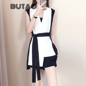 BUTAO 香港潮牌职业短裤套装女夏装新款女神范洋气时尚无袖小西装上衣名媛气质御姐两件套装女 白色+黑色【上衣+短裤】 M |