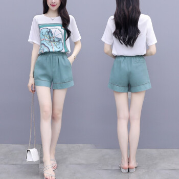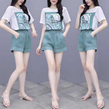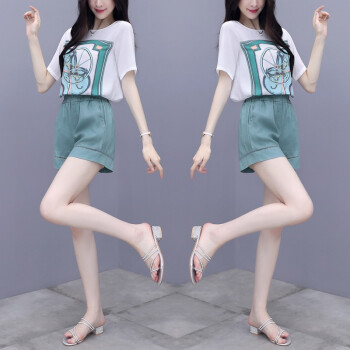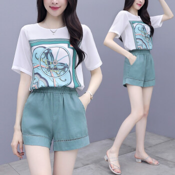 芙萝迪雅 新款洋气两件套宽松雪纺上衣配短裤女休闲时尚运动套装女夏 绿色 L |