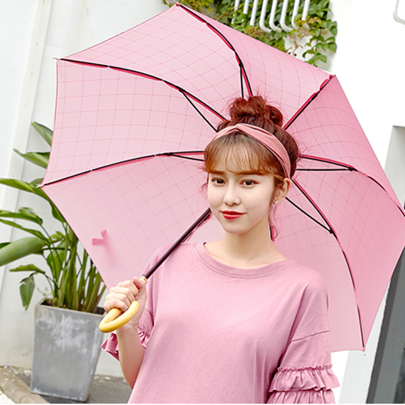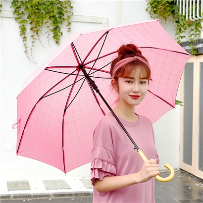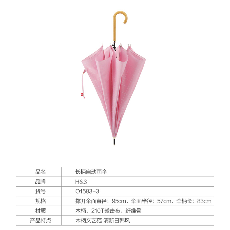 粉色长柄自动雨伞【木柄 210T碰击布 纤维骨/粉色】 |