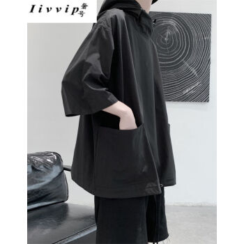 【卫衣】夏季新款短袖连帽t恤薄款卫衣男潮牌原宿风宽松港风夏季五分袖外套韩版潮流七分袖简约夏装上衣男 黑色 2XL |