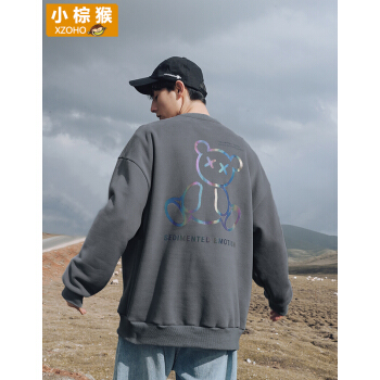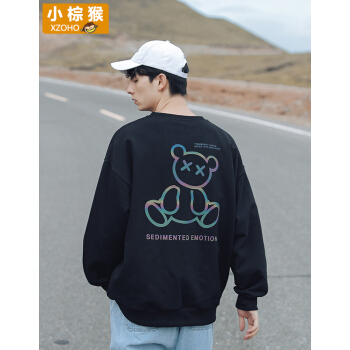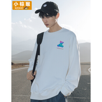 小棕猴 长袖圆领卫衣男秋季宽松白色炫彩反光潮牌小熊新款长袖T恤男宽松潮ins港风情侣卫衣男 G3045本白色 L |