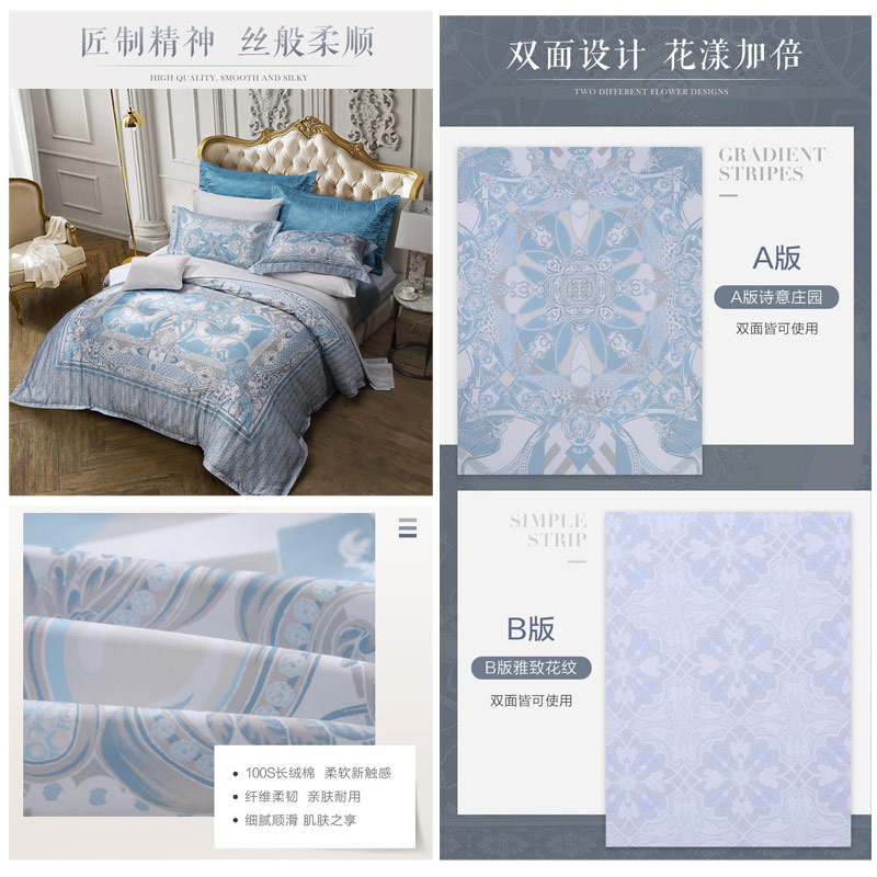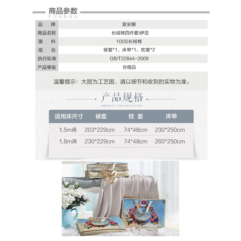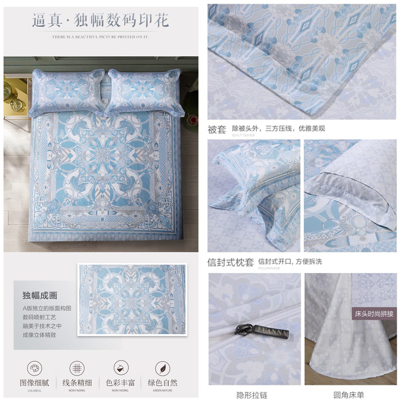 伊亚 床单四件套(被套1件床单1件枕套2件)(适合1.5米床)【100支长绒棉/蓝】 |