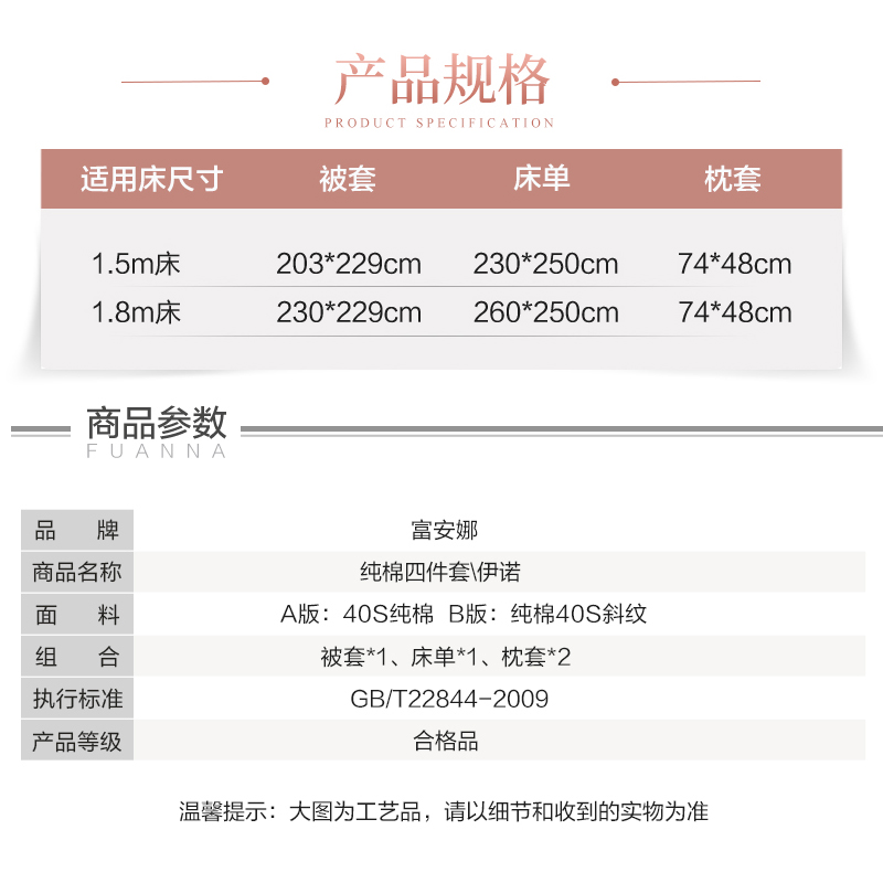 伊诺 纯棉床单四件套(被套1件床单1件枕套2件)(适合1.8米床)【40支纯棉/粉】 |