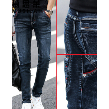慕思莱牛仔裤男春夏薄款男装男士修身透气潮流长裤韩版休闲弹力破洞小脚裤子男生直筒宽松长裤夏季男裤 02深蓝色 31码-2尺4 |
