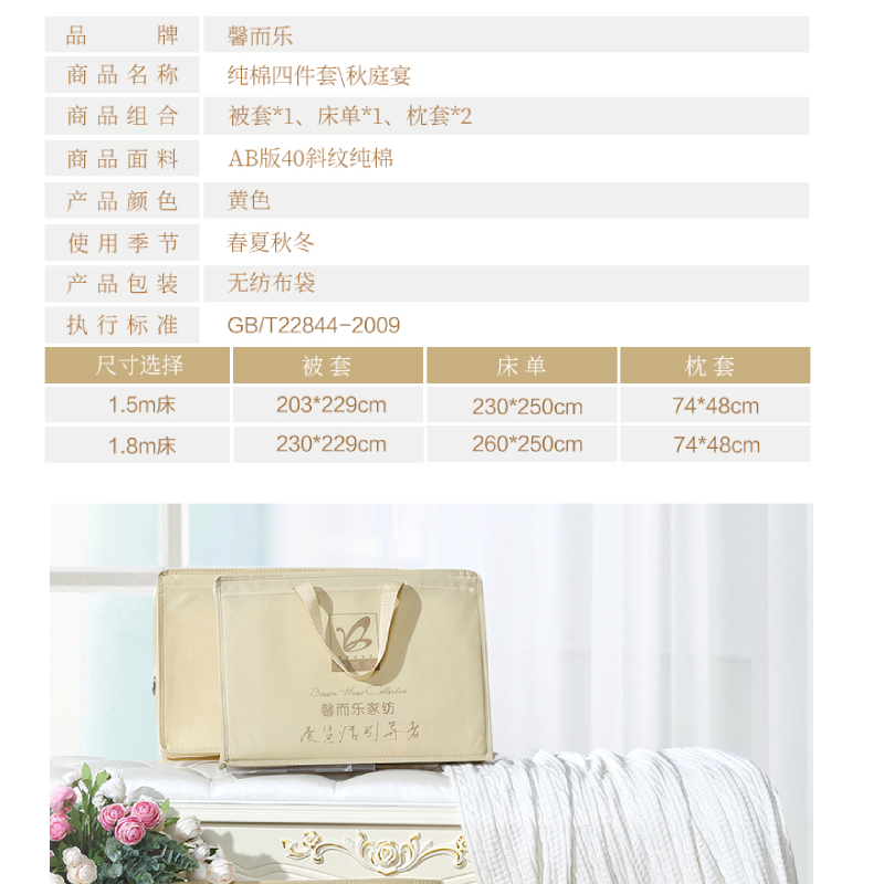 秋庭宴 床单四件套(被套1件床单1件枕套2件)(适合1.5米床)【面料:纯棉40支斜纹/黄】 |