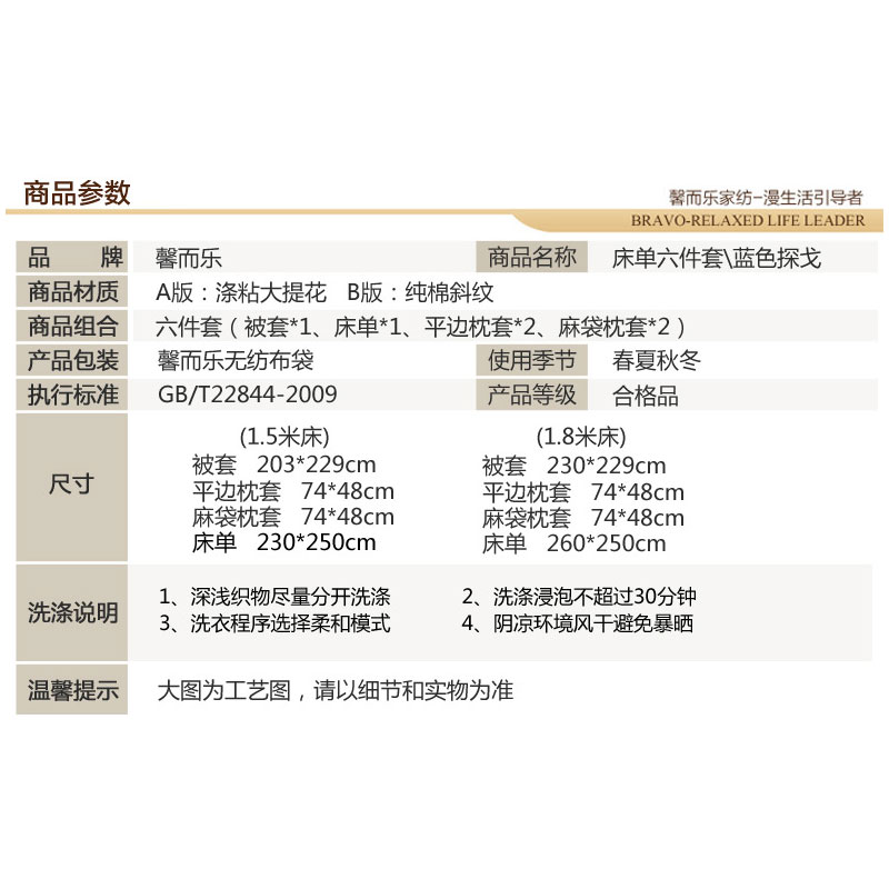 蓝色探戈 床单六件套(被套一件床单一件枕套四件)(适合1.5米床)【涤粘提花/蓝】 |