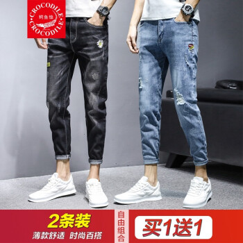【两条装】鳄鱼恤牛仔裤男夏季新款裤子男韩版潮流小脚九分裤男士宽松休闲裤男时尚百搭破洞牛仔裤男修身男裤 981黑色+897蓝色 31 |