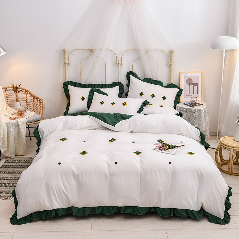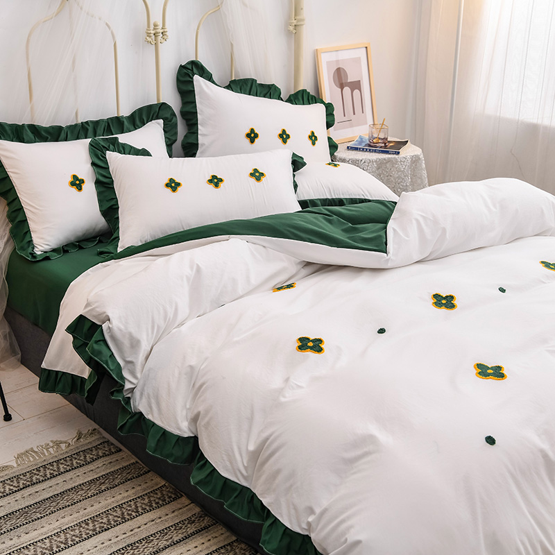【锦软贴身】泫雅花毛巾绣荷叶边四件套【聚酯纤维/四叶草-白绿】 |