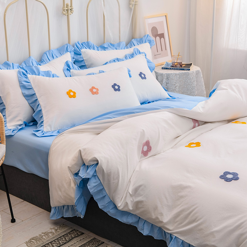 【锦软贴身】泫雅花毛巾绣荷叶边四件套【聚酯纤维/泫雅花-白蓝】 |