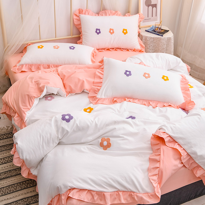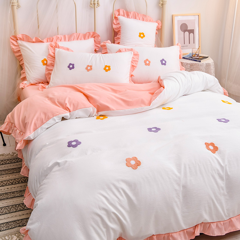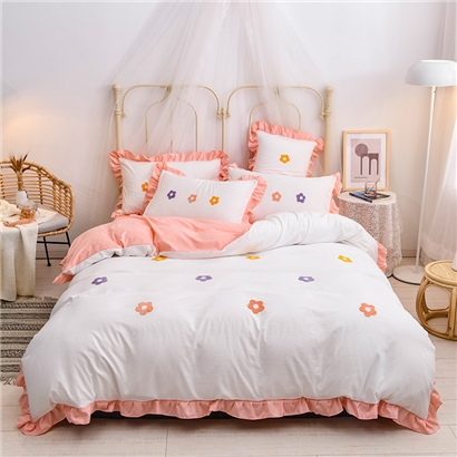 【锦软贴身】泫雅花毛巾绣荷叶边四件套【聚酯纤维/泫雅花-白玉】 |