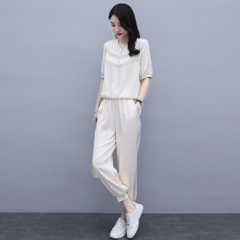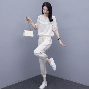杰芭锅 卫衣套装女韩版新款女夏季修身洋气时尚运动气质女神范九分裤子宽松显瘦休闲两件套潮 米白色 XL |