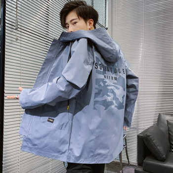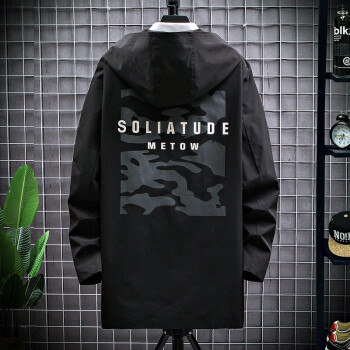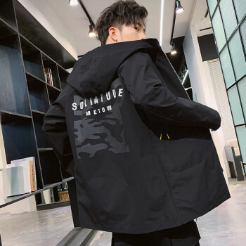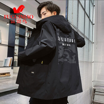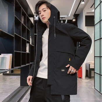 富贵鸟风衣男中长款外套春秋天青年时尚宽松连帽工装夹克男大码韩版加绒加厚潮流帅气时尚褂子上衣男 黑色薄款 XL(125-140斤) |