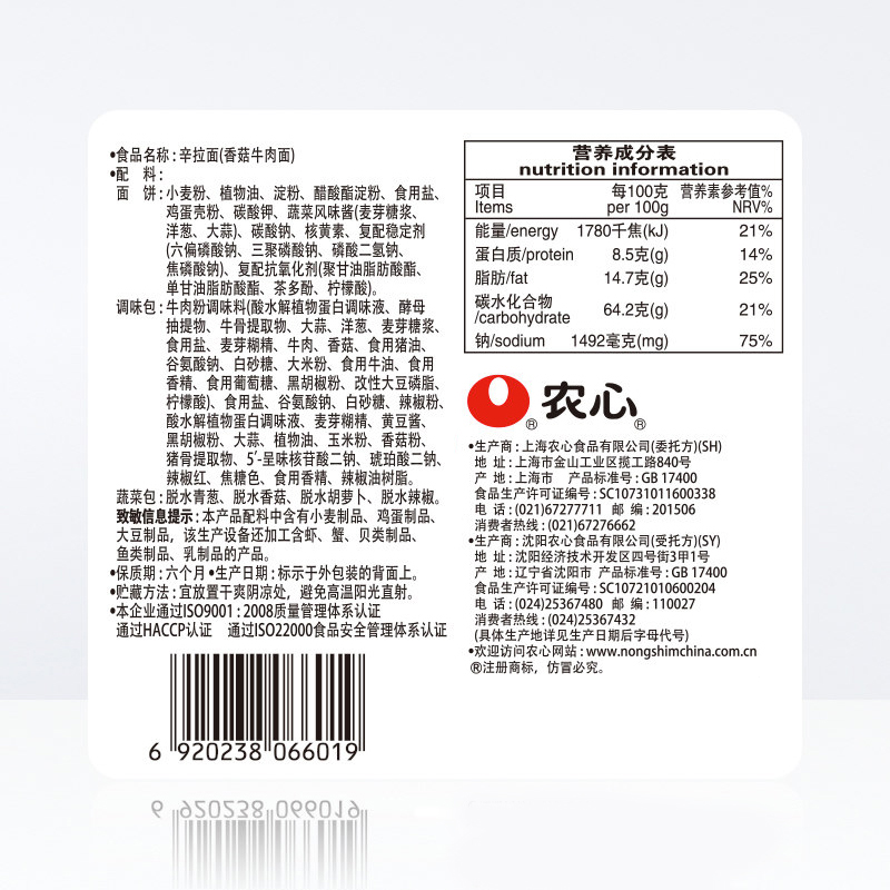 农心香菇牛肉味辛拉面方便面 |