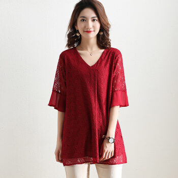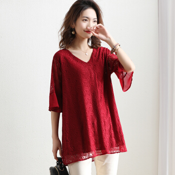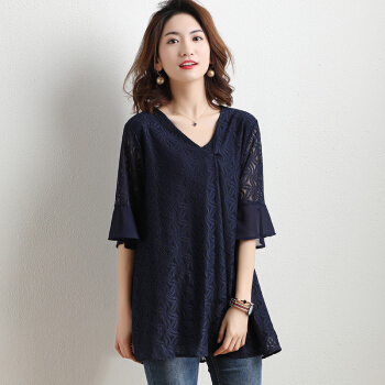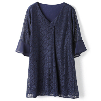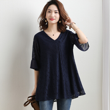 红粉宣言夏季新款百搭宽松收腰短袖雪纺上女圆领显瘦上衣 藏青色 2XL |