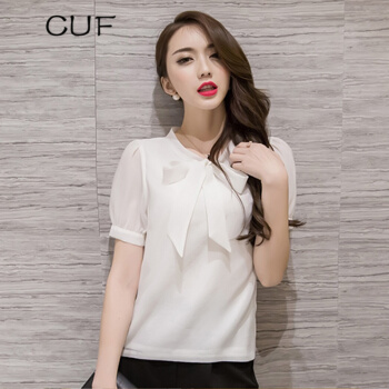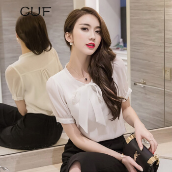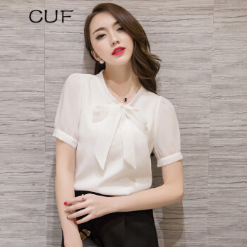 CUF 香港潮牌 雪纺衬衫女装夏季新款V领蝴蝶结职业上衣纯色显瘦短袖打底衫百搭气质 白色 S |