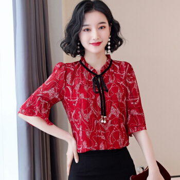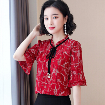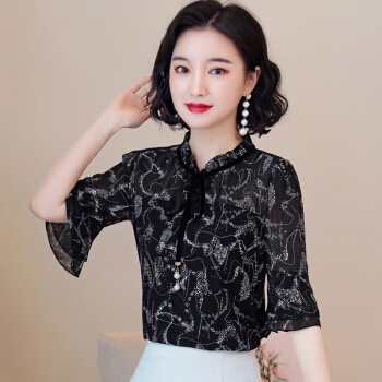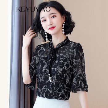 KEYUYAO轻奢高端女装 碎花雪纺衬衫女新款夏季短袖上衣洋气遮肚蕾丝配裙子小衫 黑色 M |