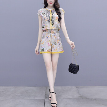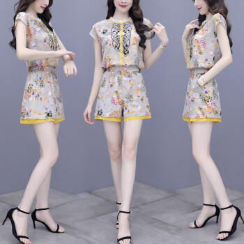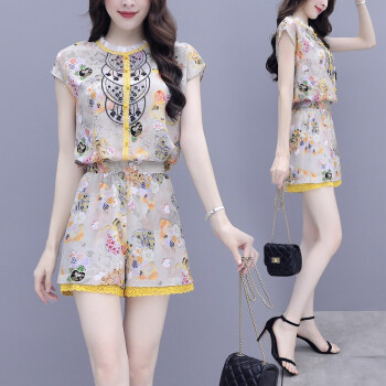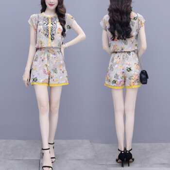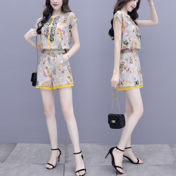 双合依恋 新款女装夏季职业装两件套裤复古宫廷风刺绣雪纺衫上衣阔腿短裤休闲时尚套装女 8380 黄色套装 M |