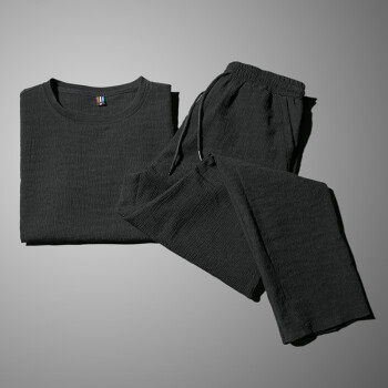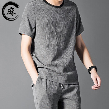 艾特兰 【上衣+裤子】男士冰丝短袖t恤夏季套装男薄款夏天一套帅气潮牌休闲运动长裤亚麻套装男衣服 925长裤套装灰色 XL(125-140斤) |